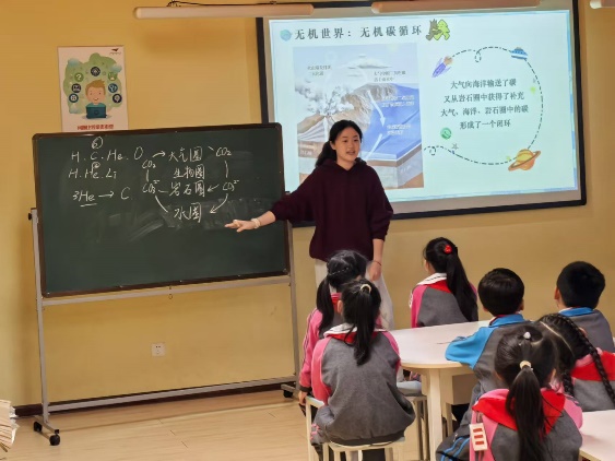 课程开始,讲师们向同学们展示了一系列关于“碳”的图片并向同学们抛出疑问“碳从哪里来?”,同学们积极举手来发表自己的观点。经过激烈的课堂讨论,讲师播放科普视频,详细解释了碳的定义和来源。