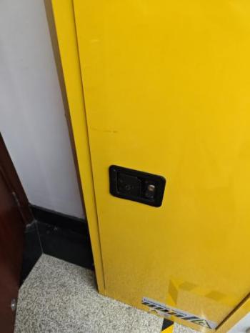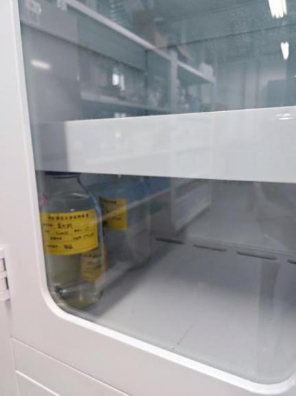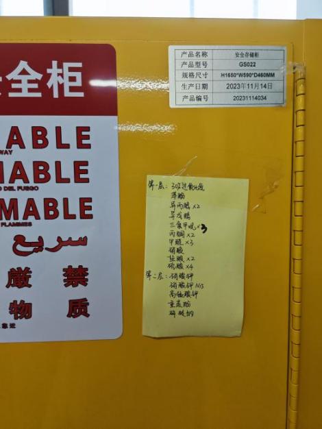 11 | 药品存储: ①药品位置不对,应该固体在上,液体在下 ②安全柜未上双锁 ③液体药品无防漏托盘 |