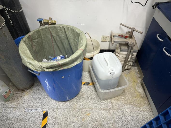 4 | 实验危废: ①实验垃圾未划分危废区域; ②废液桶未贴危废标签; ③废液过多未及时处置 |
