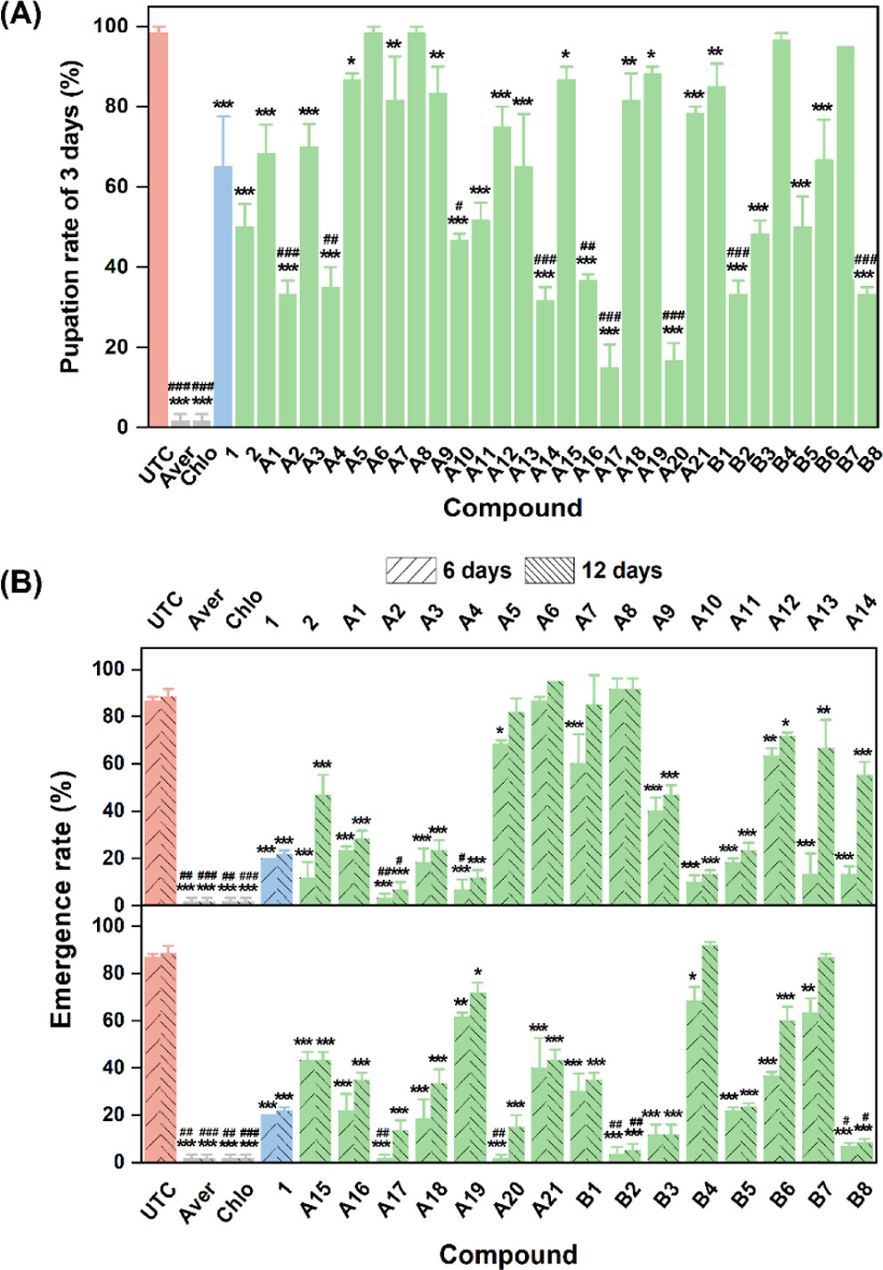 研究发现S-烯虫酯类似物乙酰胺对小菜蛾的羽化抑制活性高于常规化学农药和生物农药。化合物理化性质预测和毒理学评估结果显示S-烯虫酯高活性类似物的环境和生态风险低。分子对接结果进一步表明,S-烯虫酯类似物的生物活性可能与保幼激素受体的高亲和力有关。研究表明,S-烯虫酸乙酰胺具有发展成为鳞翅目害虫防治的生物化学农药候选产品的很大潜力。该研究是S-烯虫酯类化合物在农业害虫防治领域的首次成功探索。