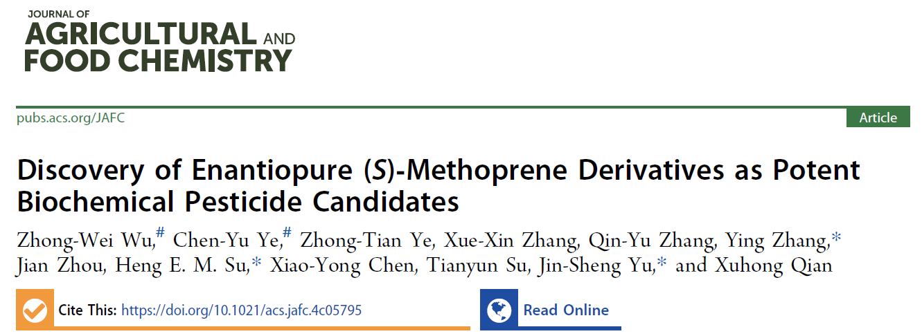 2024年10月23日,Journal of Agricultural and Food Chemistry期刊在线刊登了黄色直播 张颖副教授、化学与分子工程学院余金生教授、常州胜杰生命科技股份有限公司苏衡研究员组成的产学研联合团队的跨学科合作成果“Discovery of Enantiopure (S)-Methoprene Derivatives as Potent Biochemical Pesticide Candidates”。研究围绕S-烯虫酯这一商业化成功生物化学农药进行生物合理性的结构改造与优化,设计合成了包含酯类和酰胺类的S-烯虫酯类似物候选库,系统评估系列类似物对两类农业害虫的生物活性,旨在揭示S-烯虫酯类似物在农业害虫防治方面的潜在应用价值。